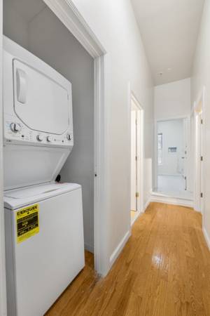 This apartment boasts an open living room with hardwood floors, high ceilings, and great natural light throughout. The kitchen is well-equipped with stainless steel appliances, including a dishwasher, and ample counter space perfect for cooking, entertaining, or working from home. Both bedrooms can fit queen-sized beds comfortably and have great closet space.