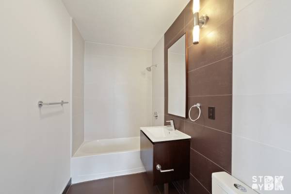 The interiors are bright with abundant natural light pouring through floor-to-ceiling windows. Breathtaking views of Brooklyn and the Manhattan skyline create unrivalled vistas. Kitchens are cutting-edge and radiate style with custom Pedini cabinets, silver- white Caesarstone countertops, Carrera marble backsplashes, and Frigidaire stainless steel appliances. Baths offer a stunning tile combination of brown hues set against pure white and feature steam showers, deep soaking bathtubs and custom-built vanities.