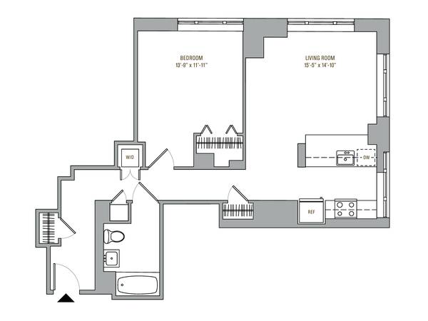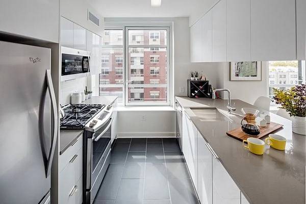 Oversized one bedroom with corner windows in living room, open gourmet kitchen equipped with top-of the-line GE stainless steel appliances, a full-sized refrigerator, pristine quartz countertops and an eating bar and an in-unit Bosch/washer/dryer. This is a corner unit with South and West facing windows.