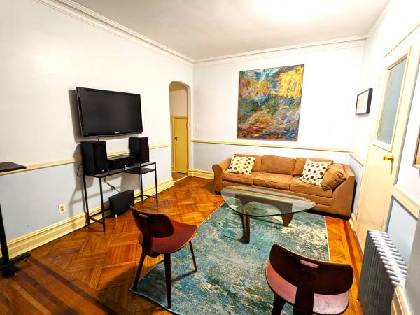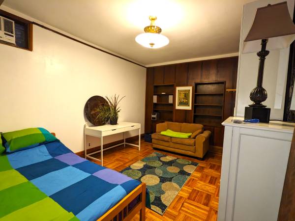 Includes all linens, bedding, towels, flatware, dinnerware, cooking utensils. Just bring your clothes and toiletries to enjoy a terrific quality of life in a great location. Rent includes, gas for range and dryer, heat and hot water. FIOS hookup ready. No smoking in apt or pets. 1 month security. Will consider bedroom unfurnished for a long, stable lease term. Second bedroom in this apartment is very occasionally used as a document research office by a non-live-in renter (CL doesn't allow me to mention her gender), so for the most part you have the apartment to yourself.