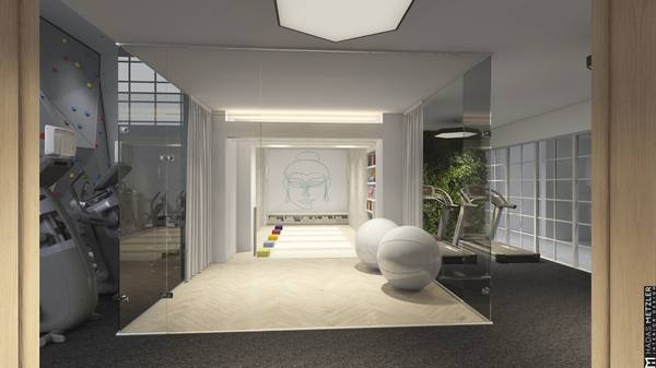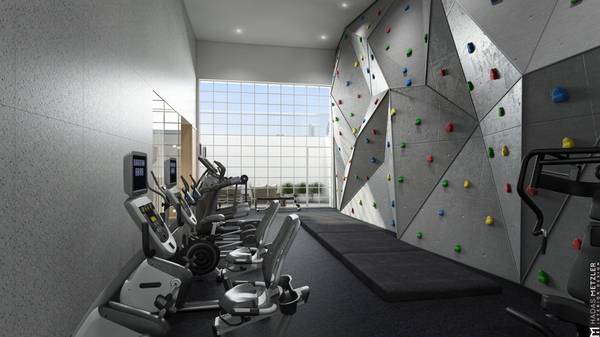 321 Wythe offers over 7000 square feet of indoor and outdoor amenities, including the grand lobby with 20' ceilings, a recreational lounge, business center, and a fully equipped gym with rock wall.