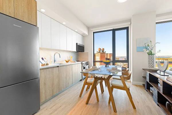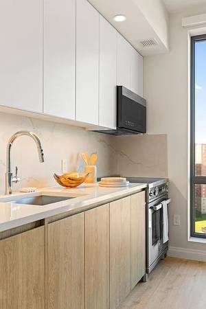 Discover elevated living at Sky Three Residences, where modern design meets coastal serenity in the heart of Southern Brooklyn. This spacious one-bedroom home features oversized triple-glazed windows that flood the space with natural light and frame stunning views of the Verrazzano Bridge or the beautifully landscaped outdoor amenity courtyard.