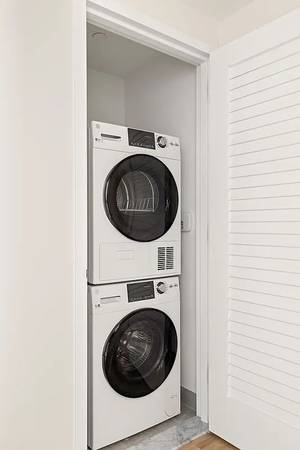 Designed with both comfort and functionality in mind, each residence offers multiple closets, wide-plank wood-style flooring, and a custom Italian open-concept kitchen with quartz countertops and premium Bertazzoni stainless-steel appliances. The spa-inspired bathroom showcases modern fixtures and a sleek vanity, while thoughtful additions like an in-unit washer and dryer, central air and heat, Wi-Fi-enabled smart locks, and custom window treatments ensure every detail enhances daily living.
