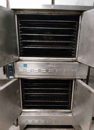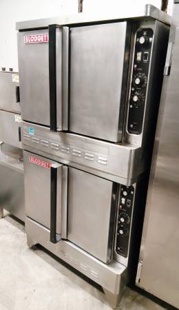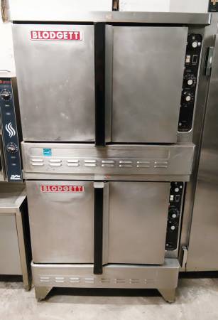 Excellent working condition commercial heavy duty Blodgett DFG-100 full size gas convection oven double set. Working great. Gas. Convection cooking/baking is much faster than conventional cooking/baking without drying the product. Perfect for any restaurant, bakery, cafeteria, bakery, bodega, deli, grocery, pizzeria, cafe or any food establishment. Great for convection cooking/baking pastries, cakes, confections, meat, fish, or any food item. Made in USA. Dimensions: 38" wide. 45" deep. 72" tall.