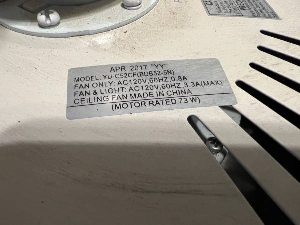 Used for 2 years. clean and works great. includes everything you need to connect it to your ceiling mounted junction box (not included). The brand is Harbor Breeze. 73W motor, 120V. It has a pull chain or can be hard wired to a wall switch (not included). The blades are 21" long. 2-sided faux wood/white. you can choose which side is up or down.