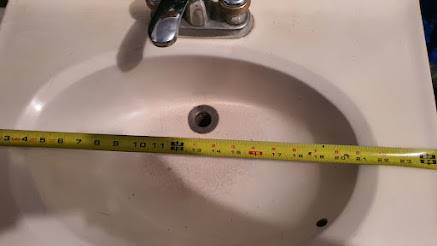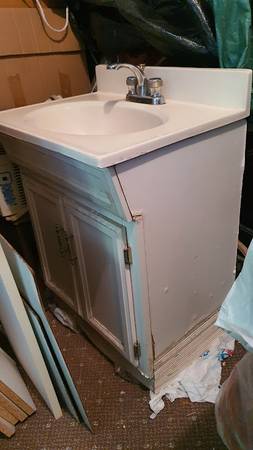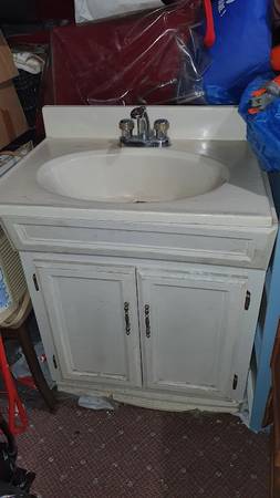 formica white cabinet with white sink and faucet combo