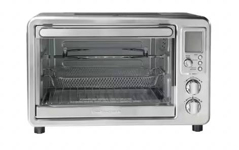 The Hamilton Beach Sure-Crisp Digital Air Fryer Toaster Oven with Rotisserie combines Sure-Crisp air frying functionality* with the versatility of a rotisserie and classic toaster oven. You get the even crisping and browning of air frying right on your countertop, along with the ability to rotisserie, toast, bake and broil. Using little to no oil, the Sure-Crisp function turns fresh or frozen French fries, chicken wings, steaks, fish, vegetables and more into crispy deliciousness that you and your family will love. The Hamilton Beach Sure-Crisp Digital Air Fryer Toaster Oven provides plenty of cooking space and lets you rotisserie a whole chicken, cook a 12 in. pizza or toast 6 slices of bread. The intuitive controls include 6 settings to cover every cooking need and a digital LED panel to keep you informed about the preheating status, remaining cooking time and current temperature. The oven features 3 rack positions for cooking flexibility and it includes a mesh air-fry basket, rotisserie accessories, bake pan, broil rack and slide-out crumb tray.