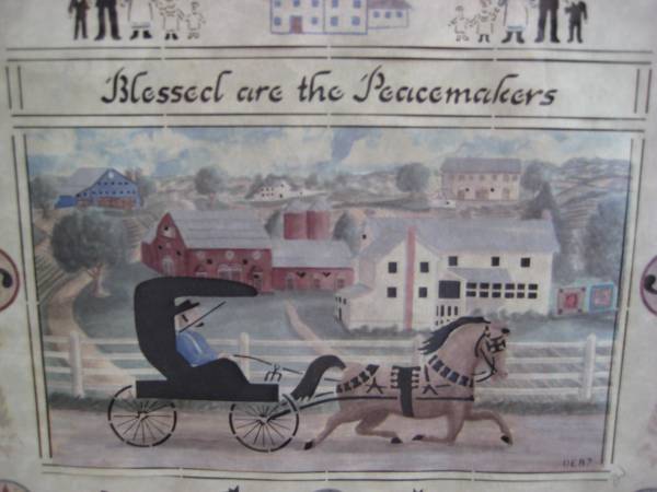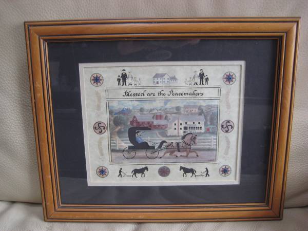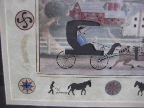 BEAUTIFUL AMISH BUGGY CUTOUT FOLK ART; SIZE: 8 X 9.5 INCHES; SIZE (FRAMED): 13 X 16 INCHES; FRAMED WITH GLASS.