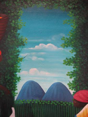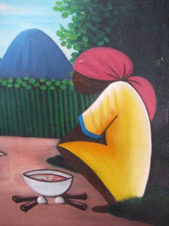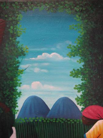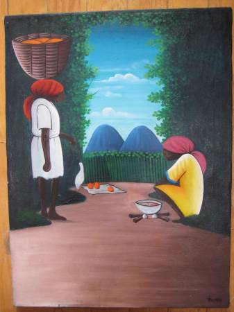 VERY BEAUTIFUL HAITIAN FOLK ART OIL PAINTING SIGNED THOMAS; OIL ON CANVAS; CANVAS SIZE: 18 X 24 INCHES; NOT FRAMED.