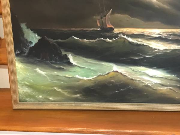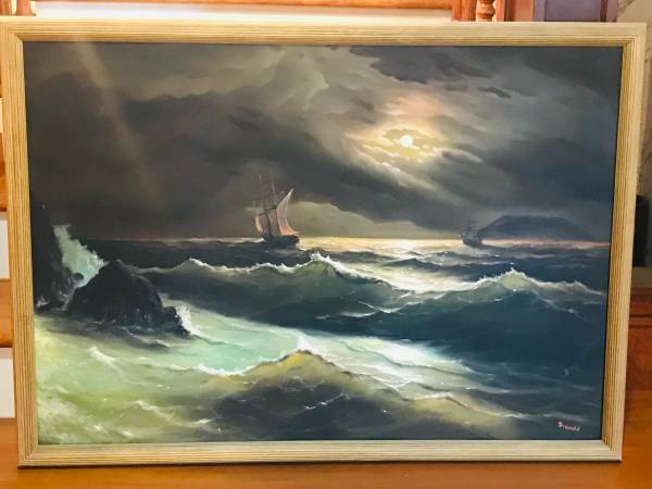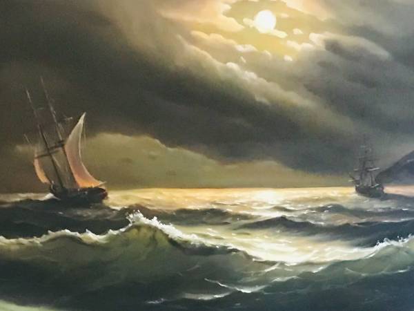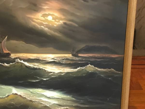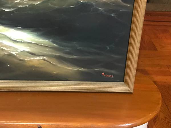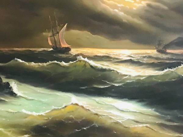 The artist: Yuri Dvornik, signed lower right. Vintage Original Oil Painting .The waves are splashing, On the evening sea there is a yacht and a ship. The sun is hidden by dark clouds. Print is 24.5"...