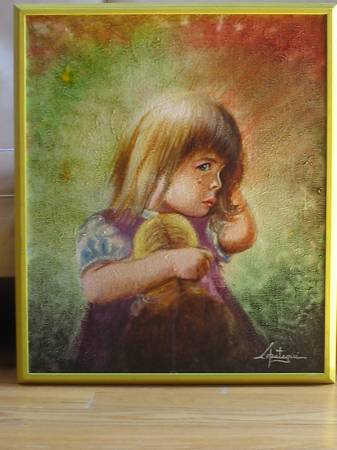 ABSOLUTELY CHARMING OIL PAINTING OF A CHILD GIRL WITH TOY BY WELL KNOWN ARTIST JUAN LOPETEGUI; OIL ON CANVAS; CANVAS SIZE: 20 X 24 INCHES; SIZE (FRAMED): 22 X 26 INCHES; NICELY FRAMED IN WOODEN...