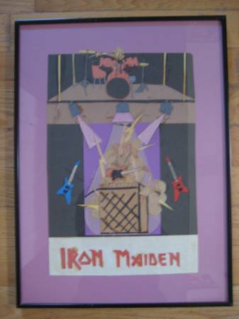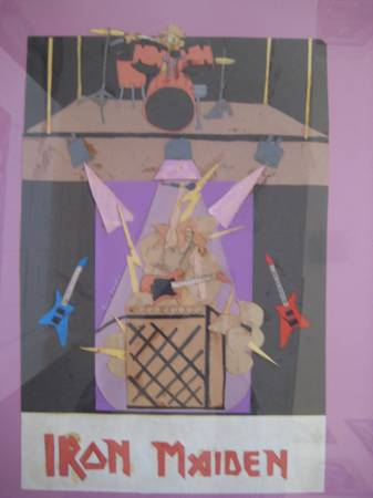 VERY INTERESTING "IRON MAIDEN" COLLAGE PAINTING BY ERIC DEVLIN; SIZE: 13 X 18 INCHES; SIZE (FRAMED): 17 X 23 INCHES; PROFESSIONALLY FRAMED WITH GLASS.