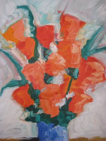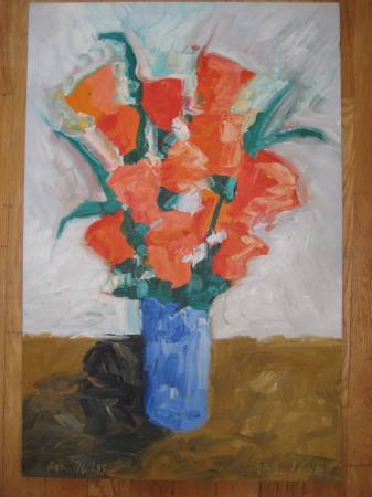 VERY BEAUTIFUL IMPRESSIONIST FLOWERS OIL PAINTING; OIL ON CANVAS BOARD; SIZE: 24 X 36 INCHES; NOT FRAMED; SIGNED INDISTINCTLY AND DATED 85 - MOST LIKELY FRENCH ARTIST; GREAT PLEASANT COLORS !