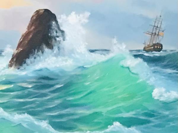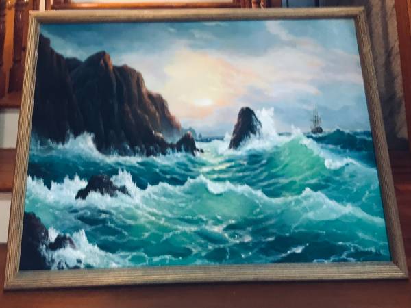 The artist: Yuri Dvornik, signed lower right. Vintage Original Marine Seascape Oil Painting. Turquoise Waves, Cliffs, Rocks. On the horizon – Sailing Vessel. Print is 24.5" x 38.5". Framed size is...