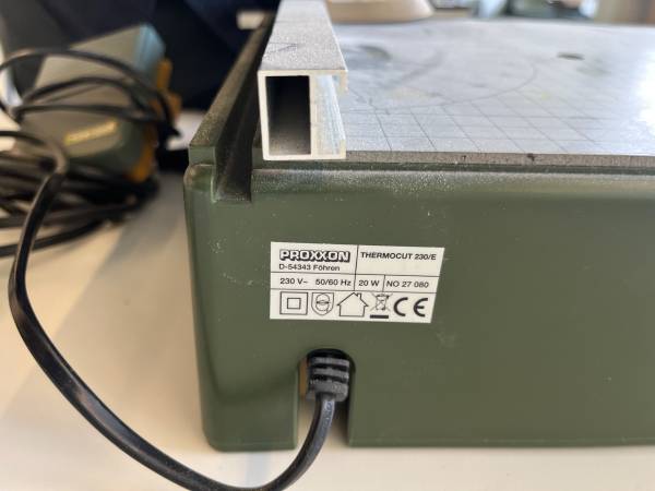 Proxxon Thermocut 230/E Hot Wire Cutter. Please note this is a European version that takes 230V. You need an inexpensive step up transformer to make it work properly. For architectural model making and cutting styrofoam, etc. Working condition. Includes the foot pedal.