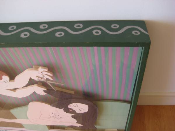 INTERESTING AND UNUSUAL WHIMSICAL SATIRICAL 3-DMIXED MEDIA PAINTING / PAINTED WOOD CARVING BY LISTED ARTIST PAMELA HUNT SHOEMAKER; SIZE: 20 X 30 INCHES; SIZE (FRAMED): 24 X 30.25 INCHES; FRAMED IN...