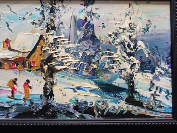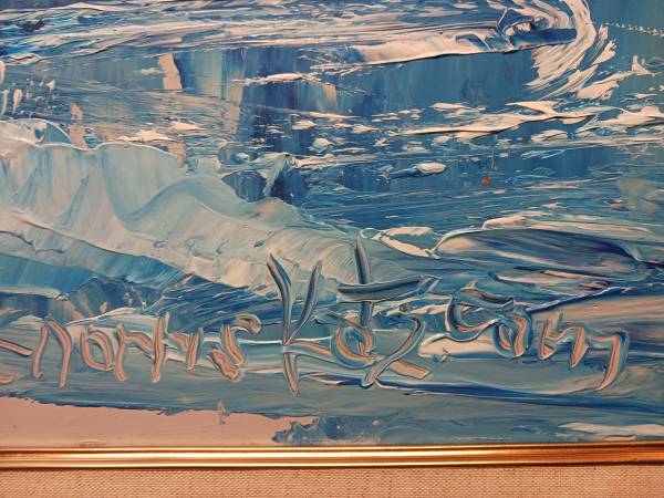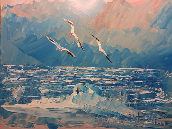 Good condition. Hand painted. Ready to hand up. Famous artist Morris Katz (In The Guinness Book). Sea Guls 28"x32". Snow 13"x24". $250 each