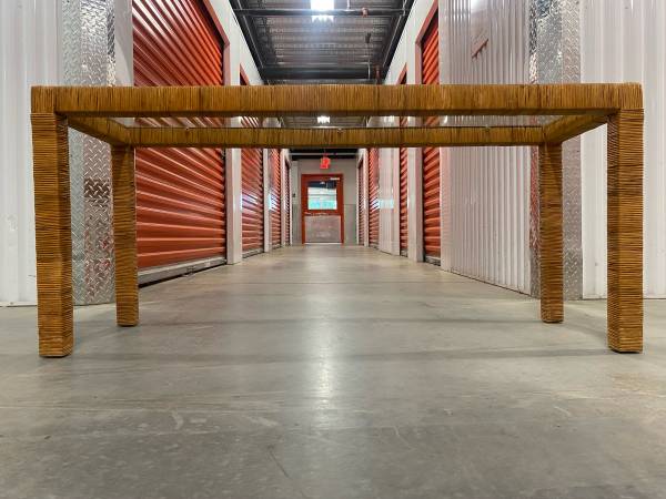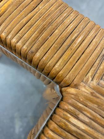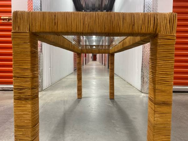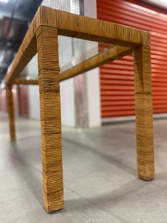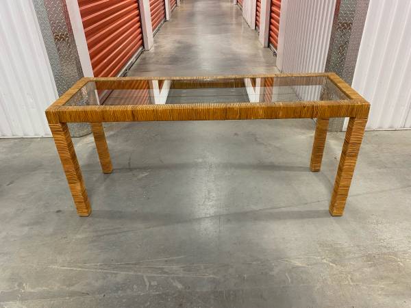 Beautiful eye catching 2inch thick rattan wrapped sofa / console table with glass top. Small chip to ONE corner of glass (see last picture). Beautiful craftsmanship and statement piece. Very nice vintage condition.