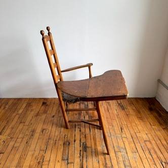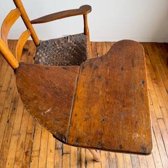 Details: Early 1900s American Shaker high ladder-back armchair with woven rush seat and attached right-side writing desk. Solid maple wood frame with curved left arm, turned finials on the back stiles, and original brass screws attaching the desk top. Farmhouse rustic appeal. Collectible and decorative, ideal for antique enthusiasts or a restoration project.