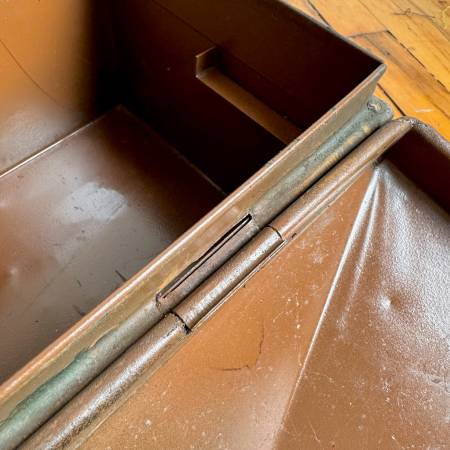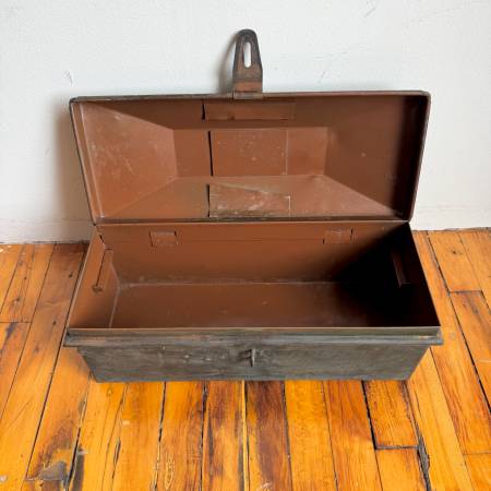 Details: Antique dark green mid 19th–early 20th century heavy-duty industrial metal tool chest, tackle box, or strongbox. Constructed of solid riveted steel with a coffin-style lid, top handle, and latch for a lock. Originally sourced from a New York City machinist’s metalworking shop; showcases authentic industrial craftsmanship and utilitarian design. Displays a rich patina and surface rust that speak to its age and history. Decorative and functional collectible piece or excellent candidate for restoration.
