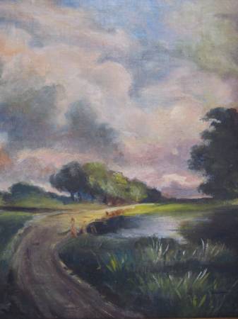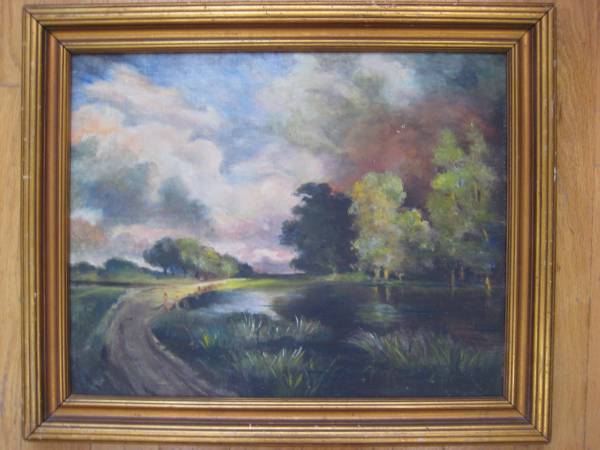 ANTIQUE LANDSCAPE OIL PAINTING; OIL ON CANVAS BOARD; SIZE: 19.5 X 23.5 INCHES; FRAMED IN WOODEN FRAME; UNSIGNED.