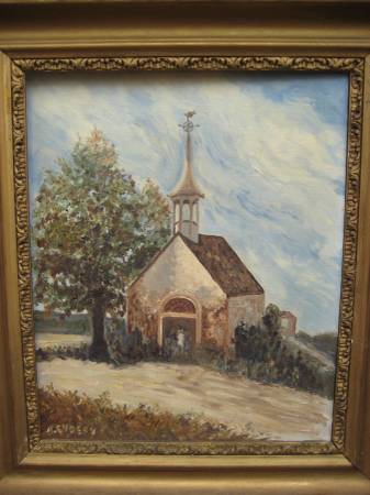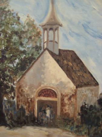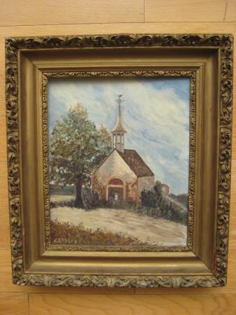 BEAUTIFUL ANTIQUE OIL PAINTING OF A CHURCH IN ILE D'ORLEANS CANADA, OIL ON CANVAS BOARD; SIZE: 10 X 12 INCHES; SIZE (FRAMED): 14.75 X 16.75 INCHES; FRAMED IN ANTIQUE WOODEN FRAME; SIGNED; GREAT...