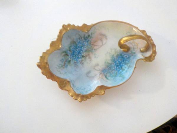 Heavy Gold Paint Trimmed Floral Candy Dish with Gold Painted Handle. Leaf shaped.