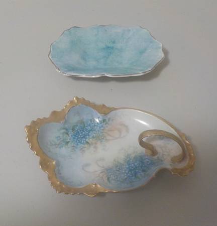 Two Antique Porcelain Candy / Trinket Dishes With Gold Trim. Leaf Shape Has Handle.