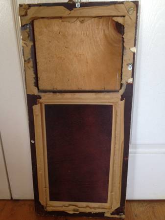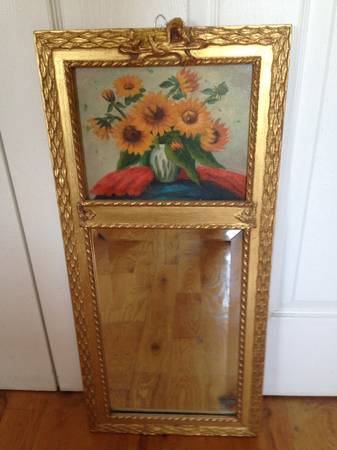 ANTIQUE TRUMEAU STYLE MIRROR WITH SUNFLOWER OIL PAINTING BY ;LISTED ARTIST ROBERT GRACE; ROBERT GRACE LABEL ON THE BACK; TOTAL SIZE: 15 X 28 INCHES.