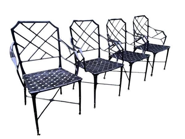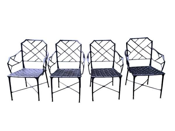 A handsome set of 4 Brown Jordan Calcutta armchairs. Made in the USA of cast aluminum. Recently refinished in a semi-gloss black. No breaks, bends or welds. The original foot pads are in nice condition. Each chair has the BJ factory imprint. Measurements: 21ʺW × 22ʺD × 34ʺH.