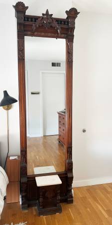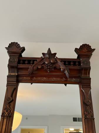 The Eastlake Antique Hall Pier Mirror with marble shelf is a stunning piece of Victorian-era furniture crafted by the renowned brand Eastlake in 1900. This full-length mirror features a rectangular shape with a brown-colored frame finished in mirrored glass, adding a touch of elegance to any room. Measuring 28" in length and 96" in height, this antique mirror also includes a marble shelf below, providing both style and functionality. Made of wood with intricate details, this Eastlake mirror embodies the intricate craftsmanship and timeless style of the Victorian era.
