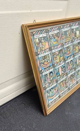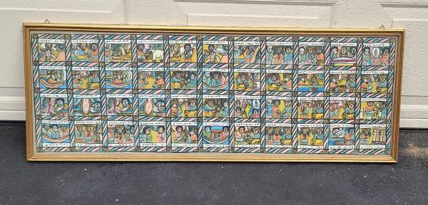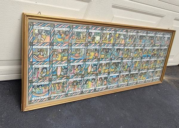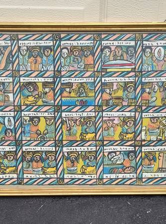 This striking Ethiopian School painting tells the legendary tale of King Solomon and the Queen of Sheba (Makeda), visualized in a 44-panel sequential storyboard. Each scene is captioned in Geβez/Amharic script, narrating the descent of Ethiopian monarchs and the Ark of the Covenantβs journey to Ethiopia. Bold, sacred, and cinematic this piece carries centuries of story in one frame.