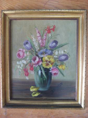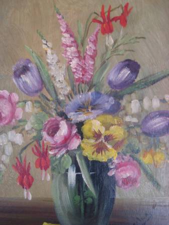 BEAUTIFUL AND FINELY PAINTED FLOWERS STILL LIFE OIL PAINTING BY WELL LISTED ARTIST JANET EDNA GREENLEAF (1936-2003); OIL ON BOARD; SIZE: 10 X 12 INCHES; SIZE (FRAMED): 12.75 X 14.75 INCHES; SIGNED J.E. GREENLEAF NICELY FRAMED IN GILT WOODEN FRAME.