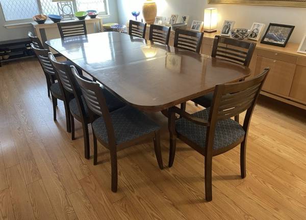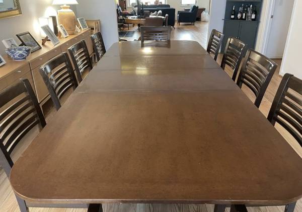 The first few photos show the table WITHOUT the EXTENDABLE leaves, the last few show it in a different space FULLY ASSEMBLED with BOTH leaves.