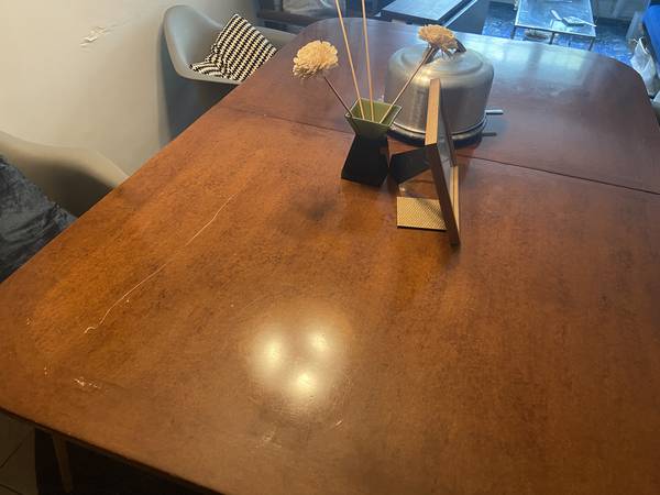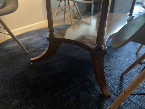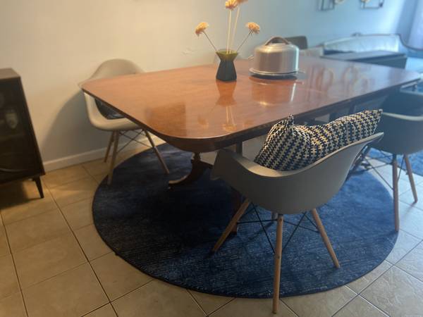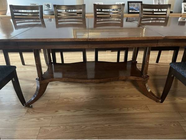 This is a gorgeous near perfect antique wooden dining table that easily comes apart and has a base on wheels.