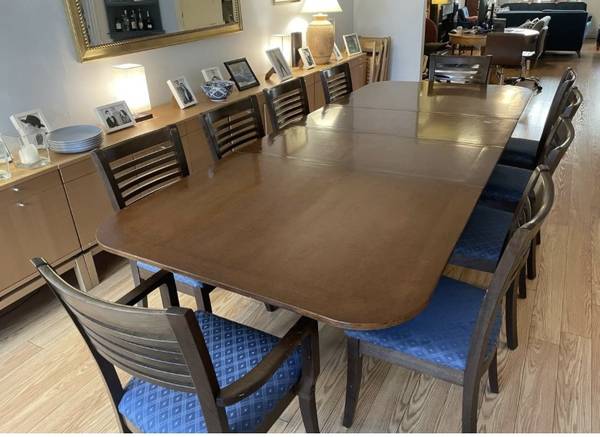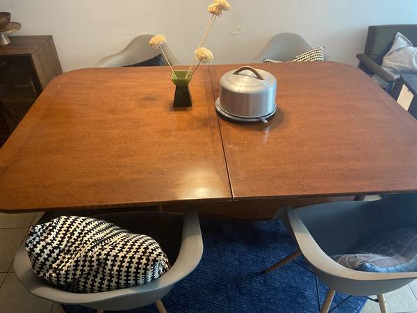 An absolutely stunning antique 1960s wooden table that is relatively lightweight, with a base on wheels and 2 leaves to extend for up to 12 people +!!!These normally go for at least triple what I'm asking.