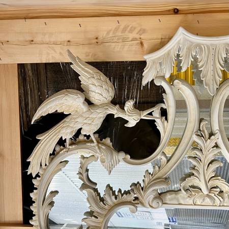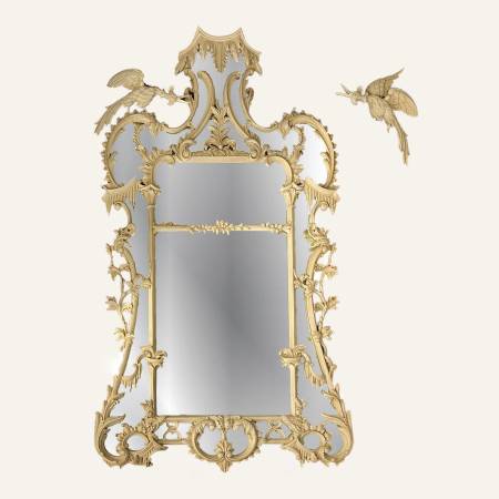 Details: Large, finely carved JONATHAN SAINSBURY Chippendale-style pier glass mirror featuring opposing “Ho Ho” birds above a decorative border with trailing branch, foliate, and stylized icicle motifs. Off-white carved frame with acanthus leaves, C-scrolls, and bird finials. Produced by Jonathan Sainsbury UK in the manner of Thomas Chippendale, reflecting Georgian, Rococo, Hollywood Regency, neoclassical, and Chinese influences. MSRP: 8K
