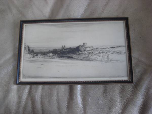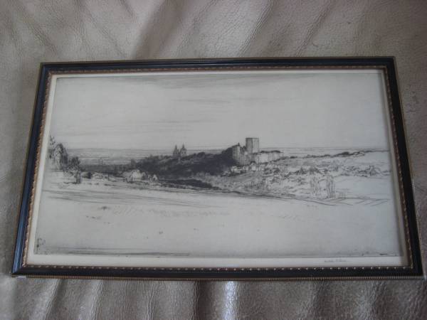 BEAUTIFUL 1929 ETCHING OF LOCHES CASTLE BY FAMOUS BRITISH ARTIST MALCOM OSBORNE; SIZE: 8.5 X 14 INCHES; SIZE (FRAMED): 9 X 15 INCHES; PROFESSIONALLY FRAMED WITH GLASS; HAND SIGNED IN PENCIL; GREAT...