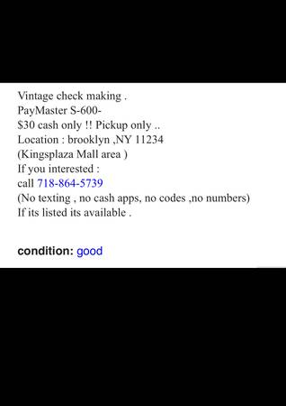 Vintage check making . PayMaster S-600- $30 cash only !! Pickup only .. Location : brooklyn ,NY 11234 (Kingsplaza Mall area ) If you interested : call (No texting , no cash apps, no codes ,no...