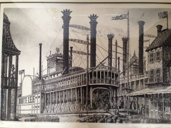 BEAUTIFUL FINE ETCHING OF ROBERT LEE STEAMBOAT BY LISTED ARTIST ALAN JAY GAINES; SIGNED IN PENCIL AND DATED 1976; LIMITED EDITION ETCHING/ENGAVING ON PAPER - SIGNED IN PENCIL; SIZE: 13.5 X 18 INCHES; SIZE (FRAMED): 22 X 27 INCHES; IN GOOD CONDITION - PLEASE DISREGARD PHOTO SHADOWS; NICELY FRAMED - GREAT ADDITION TO YOUR COLLECTION !