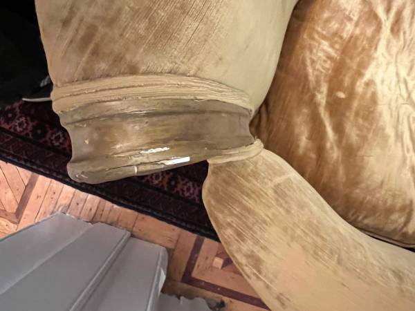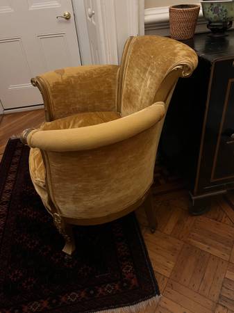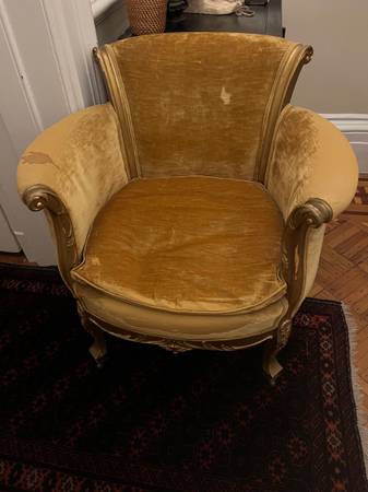 We are selling this beautiful antique gilt velvet upholstered armchair. The chair measures 33 inches high, 32 inches at its widest point, 17 inches from the seat to the floor and 17 inches at its deepest point. The chair is in sturdy condition, though I would suggest it be reupholstered as there are several stains and rubbed arms, also, there are places that the gilt needs to be retouched (see photos). This is a great chair that will add a flair of interest to any room!