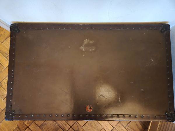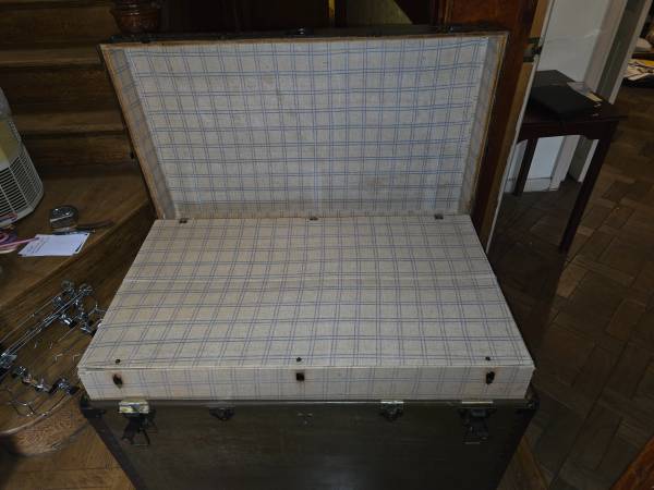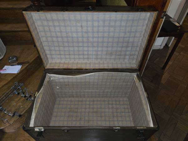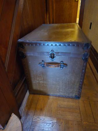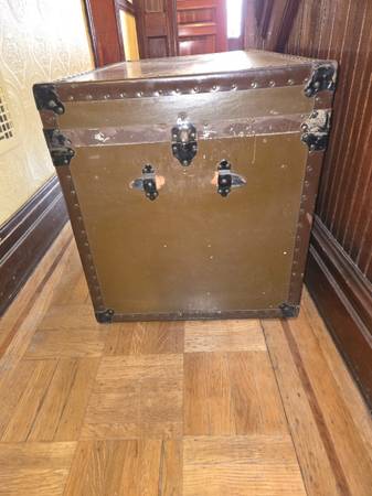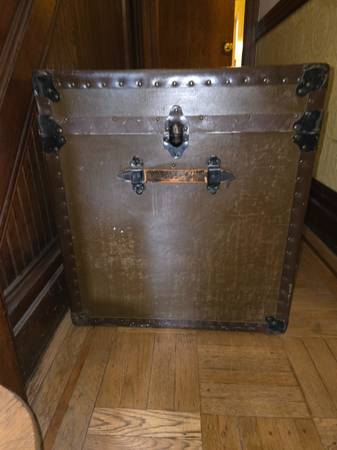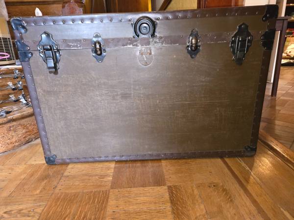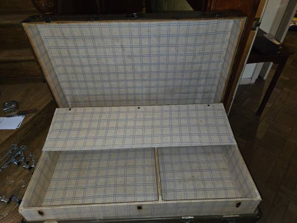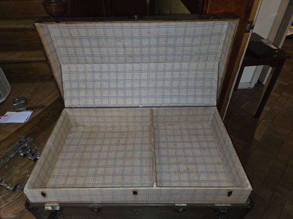 Sturdy antique vintage wood trunk. Has removable inner covered shelf. Please note center lock is missing. Dimensions: 36" Wide x 21.5" Deep x 24" High. Smoke and Pet Free Home. CASH ONLY, MUST...