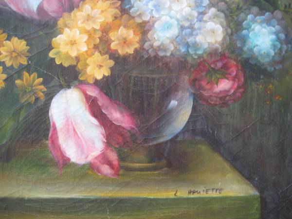 BEAUTIFUL VINTAGE FLOWERS STILL LIFE OIL PAINTING; OIL ON CANVAS; CANVAS SIZE: 20 X 24 INCHES; NOT FRAMED; SIGNED; IN GOOD CONDITION - HAS PATINA; GREAT ADDITION TO YOUR COLLECTION !