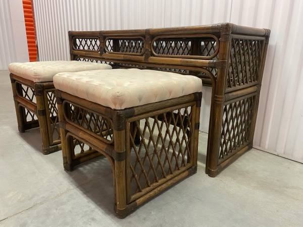 ‼️Available‼️ Vintage Rattan Console Table and Upholstered Stools Set Original scallop upholstery. Three glass table top panels for each top section. Good vintage condition. Minimal wear....
