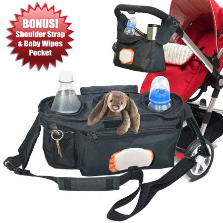 The Angel Baby Stroller Organizer with Cup Holders is a practical and stylish accessory designed to make outings with your baby more convenient. It features spacious compartments to hold essentials like diapers, wipes, and snacks, along with built-in cup holders to keep your drinks secure. The sleek black design complements most stroller styles, and its adjustable straps ensure a snug fit on various stroller handles. Perfect for parents on the go, it helps keep everything organized and within easy reach.