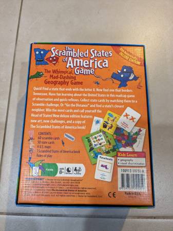 Whoever said that learning about U.S. geography had to be boring must not have read The Scrambled States of America. We fell head-over-heels for Laurie Keller's hilarious story and knew that it had the making for a great game. As with her book, we hope our game provides a fun way to enrich basic knowledge of U.S. geography. Players learn the names, capitals, nicknames, shapes and positions of the states through a myriad of visual teasers, language riddles and geography challenges. After playing, you'll see that there's more to the 50 States than meets the eye!