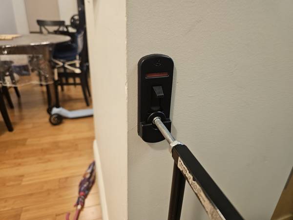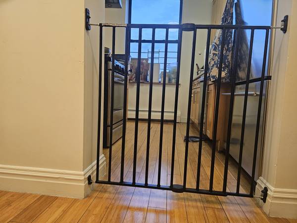 Selling two Perma Child Safety 36-inch High Extra Wide Swing Baby Gate in warm black. Perfect for safely securing doorways, hallways, or staircases to keep babies and toddlers safe. Features a locking indicator for peace of mind and easy installation.