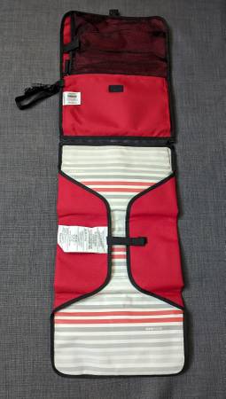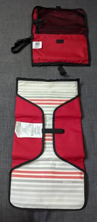 Measures approximately 11 3/4” wide x 8.25” tall when folded. Changing pad itself measures approximately 23.5” long x 21.75” wide. Only used about a dozen times, and in excellent, like-new condition. Bright red exterior helps the changer stand out amongst your other belongings, and the inside features a neutral, calming striped gray pattern. Usually retails for approximately $30.