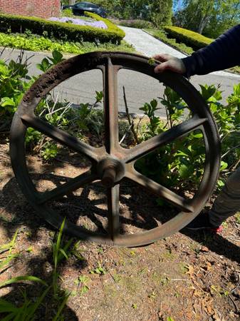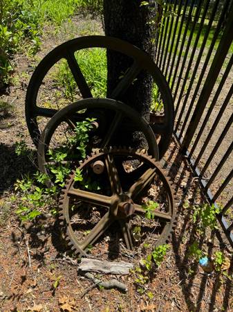 Lot of 2x Vintage Elevator Wheels. All pulled from an industrial elevator in a mill building in Connecticut. Local Pickup only. although only three wheels are pictured here, i had four originally and sold 2x of them. I have 2x of the same medium sized wheels that you see in between the larger wheel and smaller wheel with the teeth.