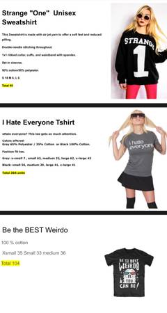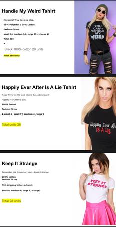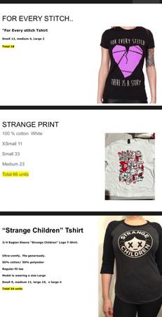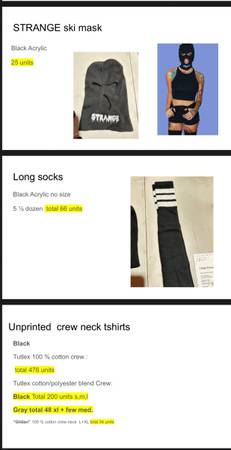Total printed tshirts 1394 units Accessories: masks 25, socks 66, Bags 20+ Unprinted crew neck Tshirts 758 units Unprinted tank/Racerback tanks 770 units